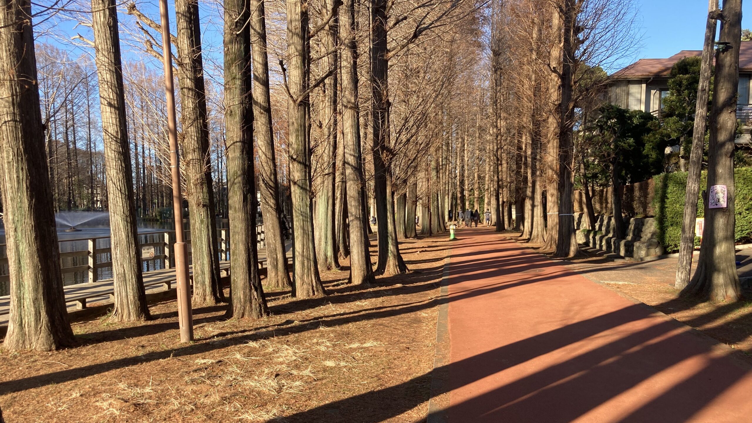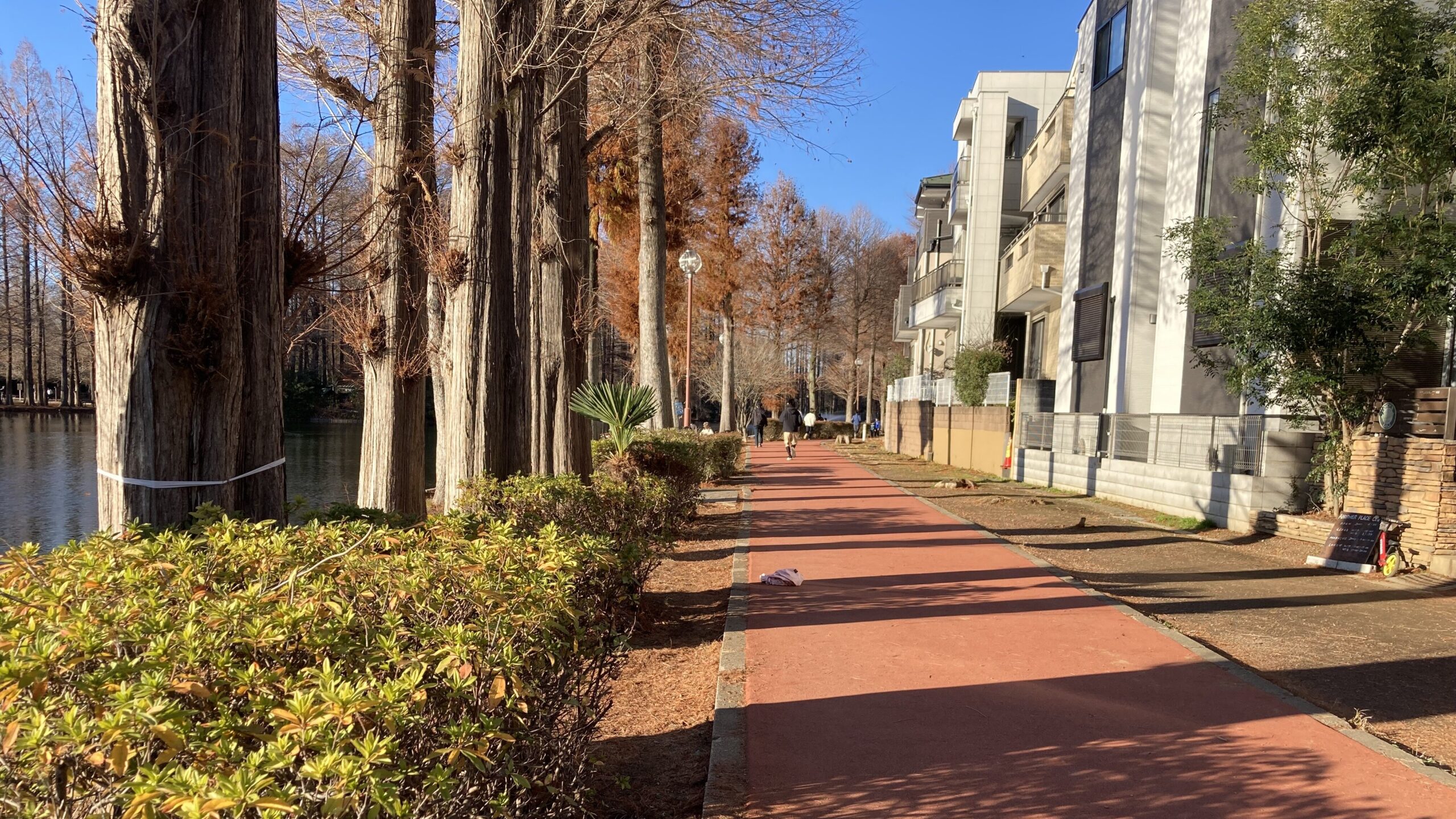 住宅街の中にありながら、木々に囲まれた緑豊かな景観が広がっています。